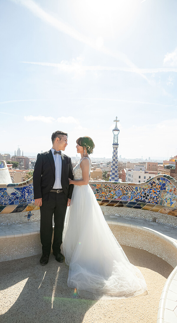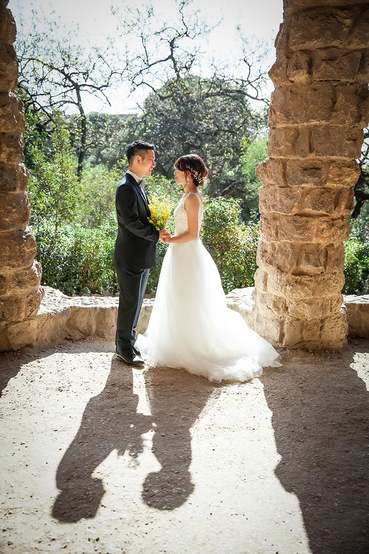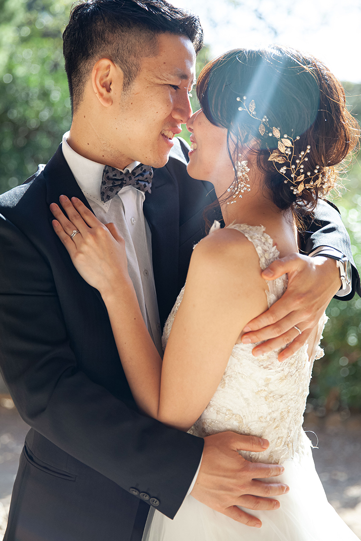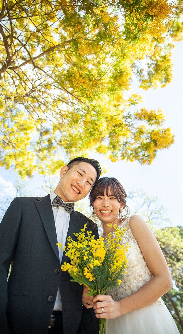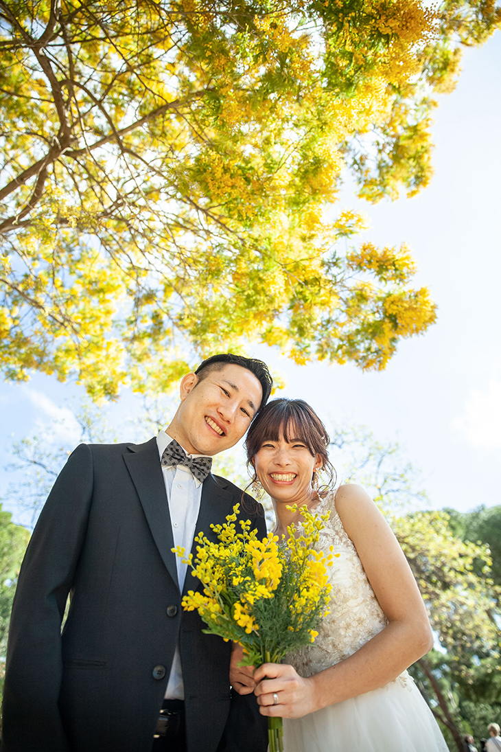 Pretty yellow pointing Color 黒のタキシードは固い雰囲気が出てしまいがちですが、その場合は柄で遊びを演出。コーディネートの邪魔にならない振り切らないモノトーンを選ぶところがポイント。スタイリッシュな印象そのままに新婦ドレスのタイトなIラインがとても落ちついてまとまっていて素敵です。 CATEGORIESイエロー系ブーケ, 公園, 春SEASON1月中旬BOUQUET現地レンタルブーケ/ミモザHAIR MAKEUPシニヨンスタイルCOLOR COORDINATION