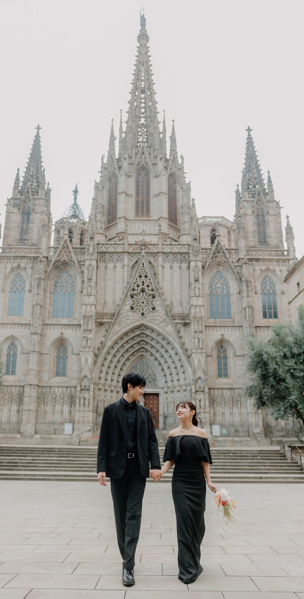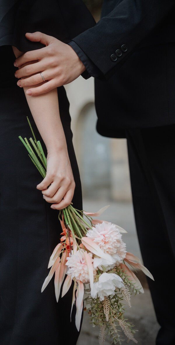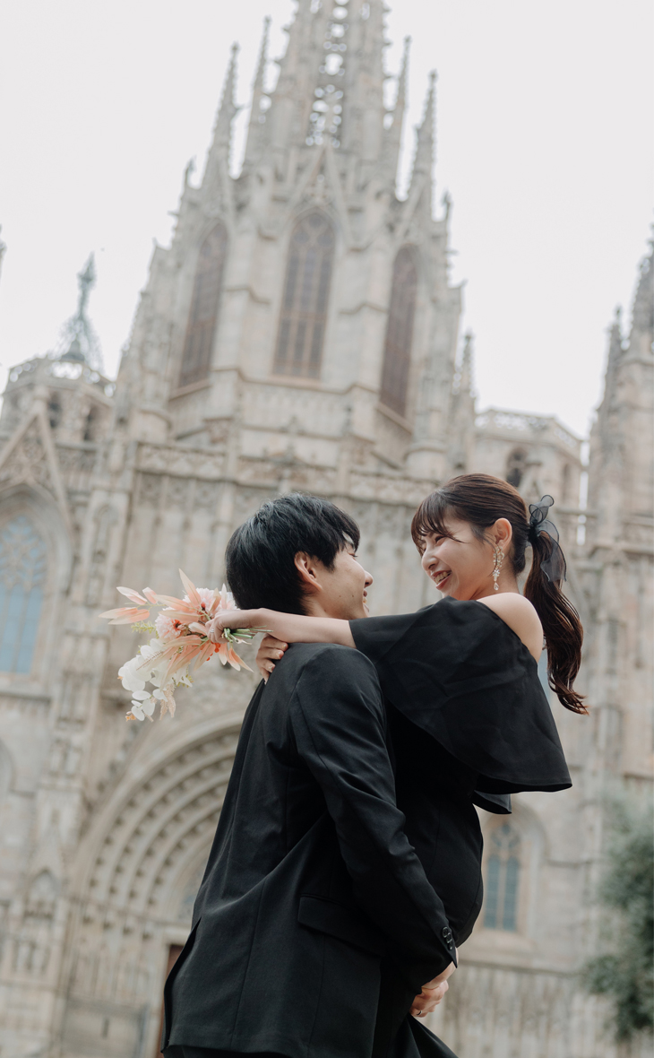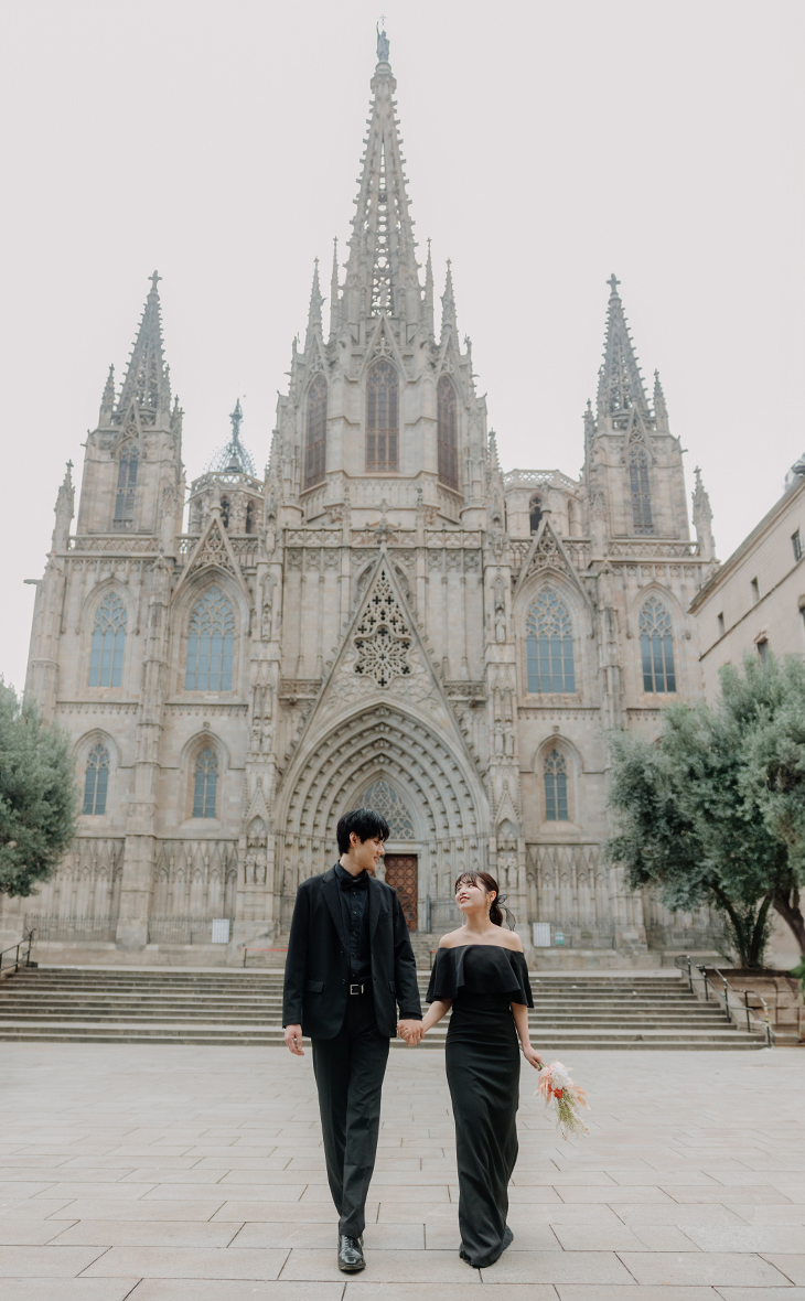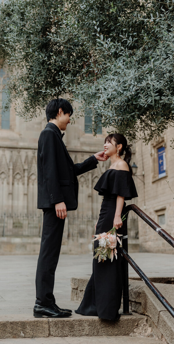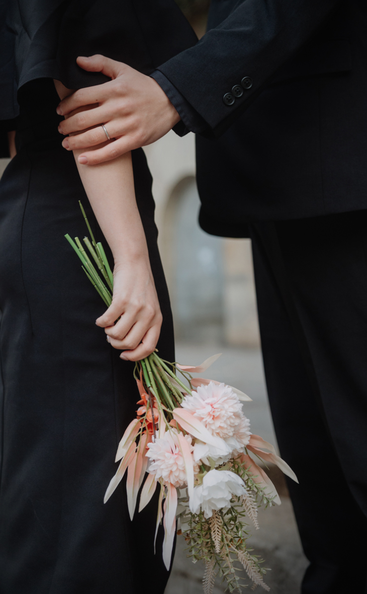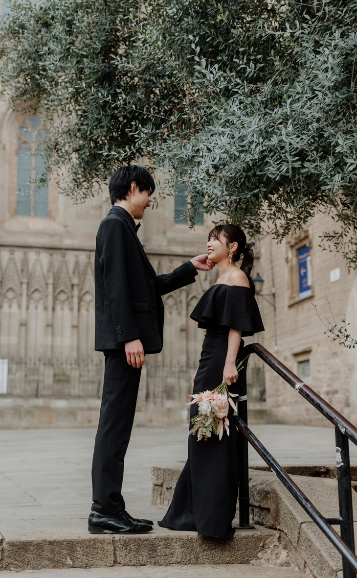 Soft pink harmony オールブラックのシックな装いをセンス良くライトサーモンピックでゆるりと抜いたコーデは、黒の固すぎる印象をソフトタッチに仕上げ可愛らしくまとまっています♪秋のグレージュの街並みにぴったり。 CATEGORIESカテドラル, ゴシック地区, ピンク系ブーケ, 秋SEASON11月初旬BOUQUETダリア/ポピーHAIR MAKEUPポニーテールCOLOR COORDINATION
